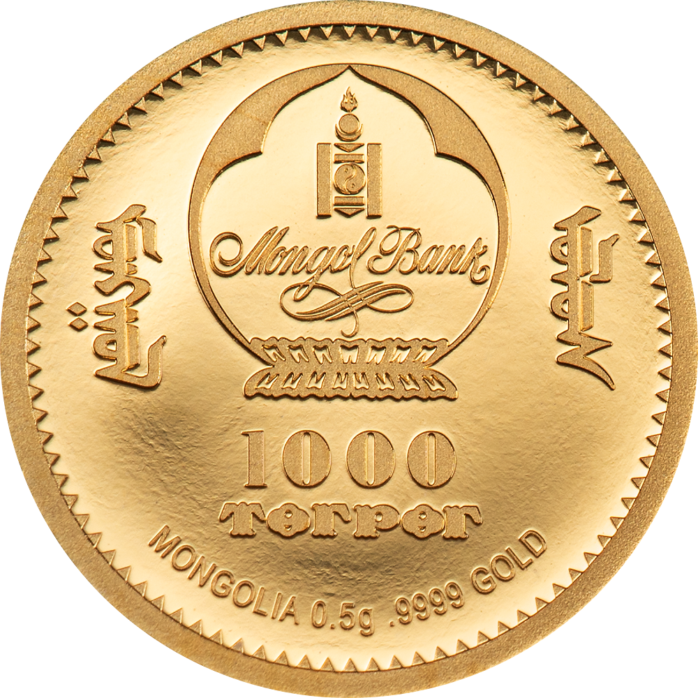 • Valor nominal: 1.000 Tögrög | Material: Oro .9999 | Peso: 0,5 g | Diámetro: 11 mm