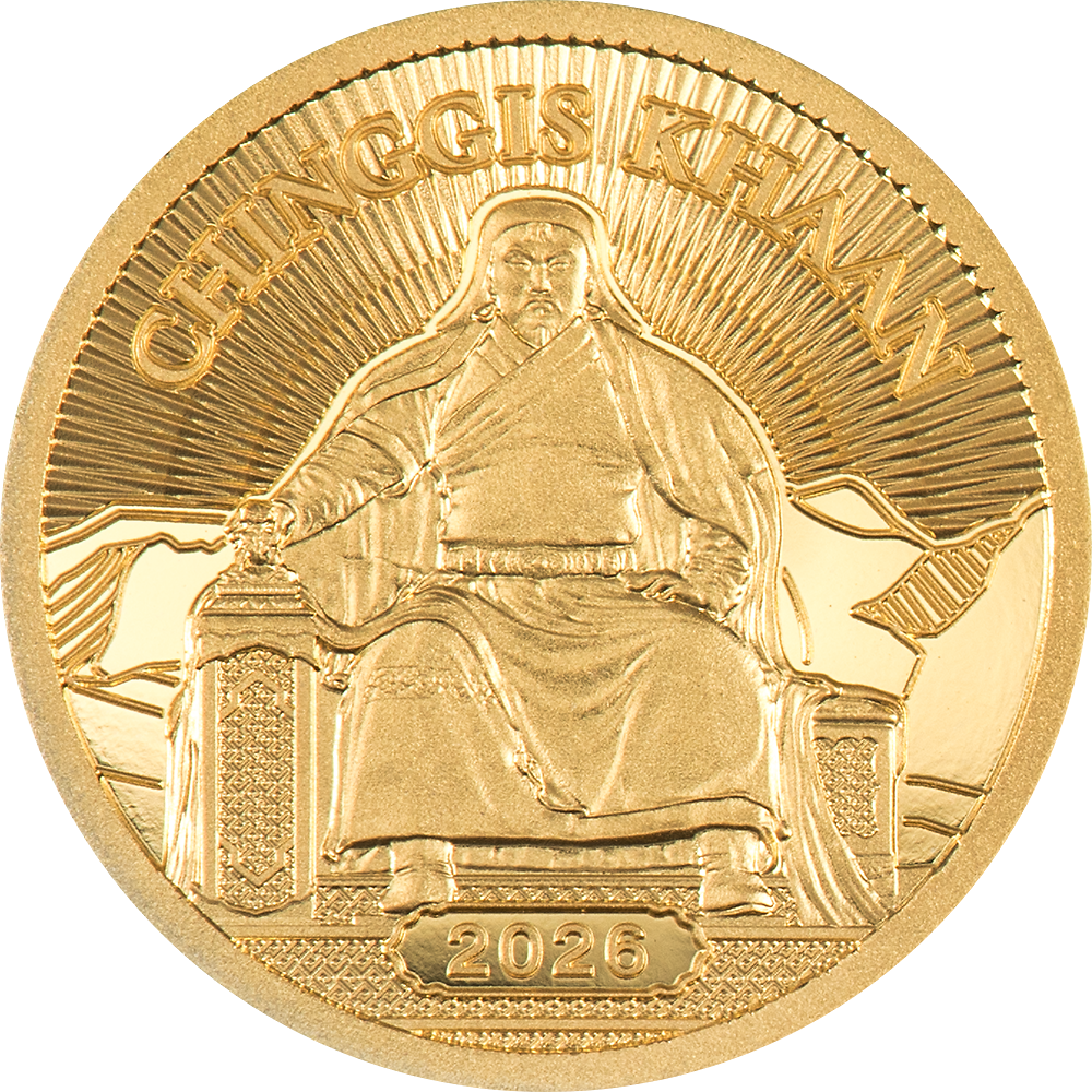 Esta moneda de oro de 0,5 g se emite con una tirada de 2.026 ejemplares. Es una de las tres versiones de la colección Gengis Kan, junto a la de 1 oz en plata (tirada: 1.500) y la de 1 oz en oro (tirada: 100). Nota: la caja de presentación es opcional y se adquiere por separado.