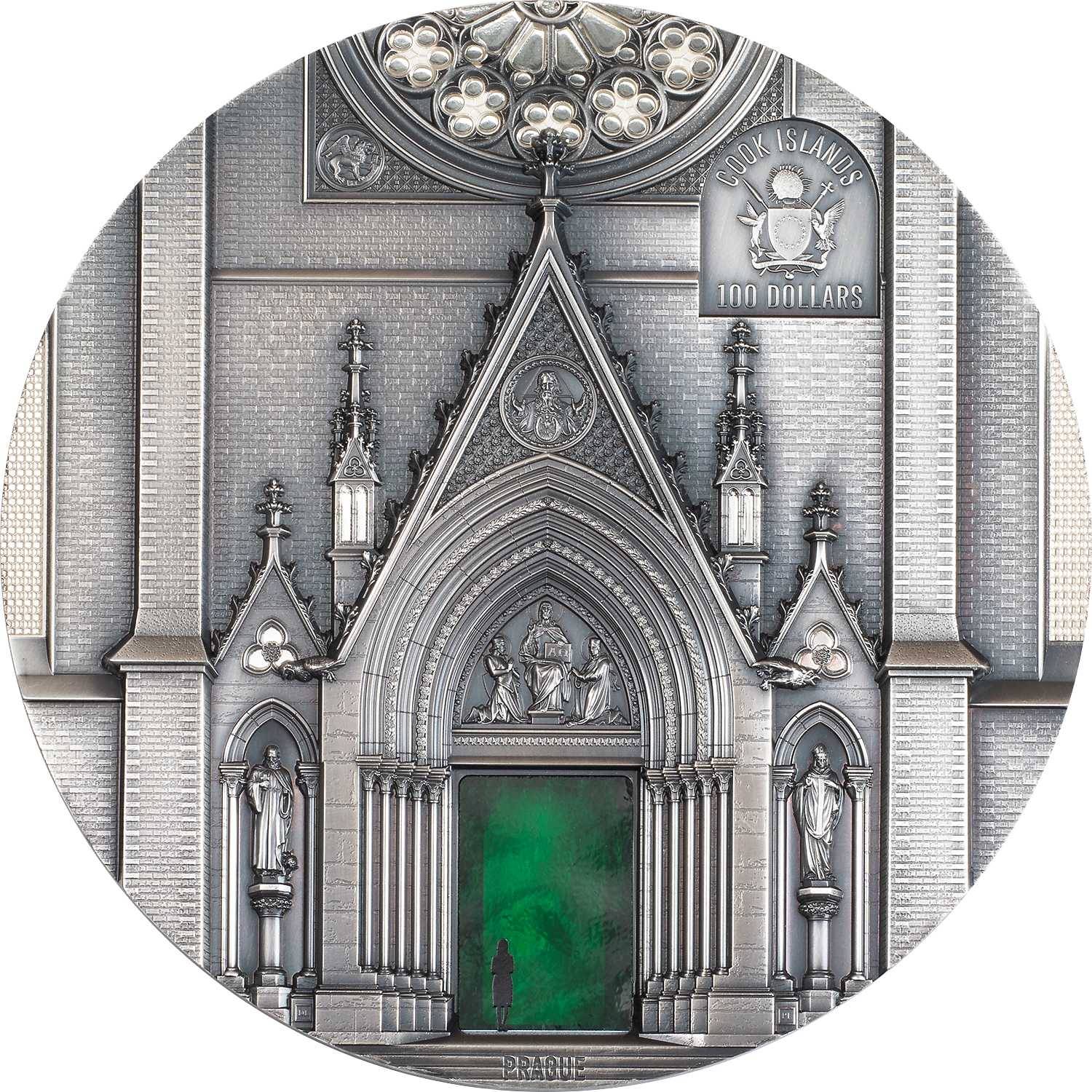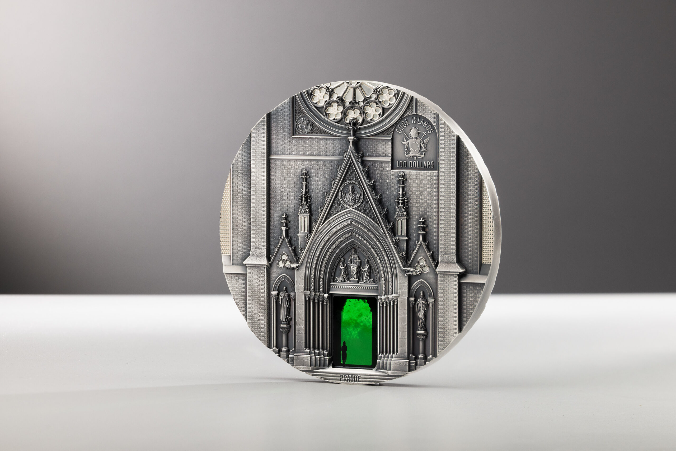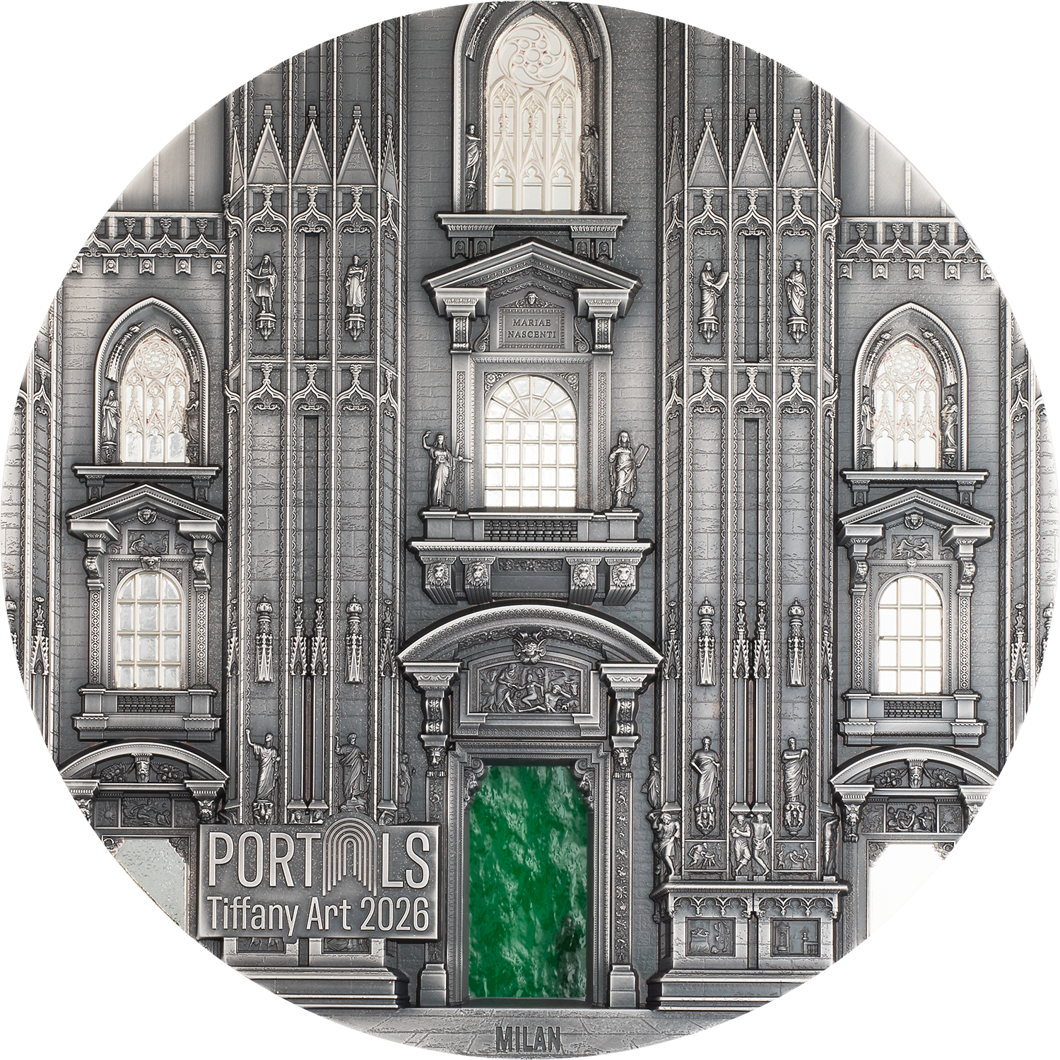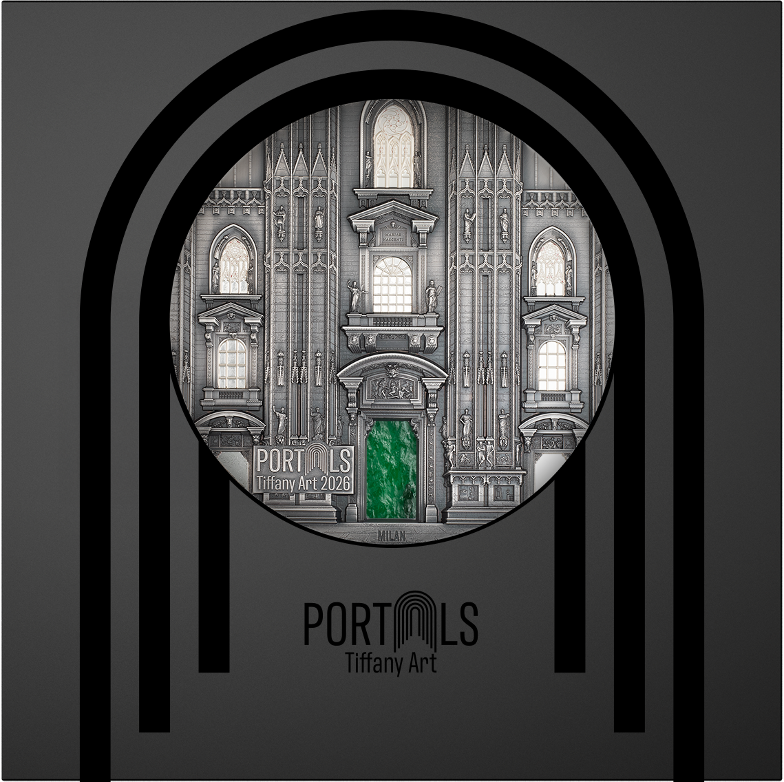 Lo que hace especial a esta serie es que cada moneda combina dos portales impresionantes. La primera emisión presenta la majestuosa fachada principal de la Catedral de Milán en el reverso, mientras que el anverso muestra la entrada a la Iglesia de Santa Ludmila en Praga. Un deslumbrante elemento de conexión es el cristal Tiffany verde, que simboliza los portales abiertos en ambos lados y los ilumina con una luminosidad mágica.
