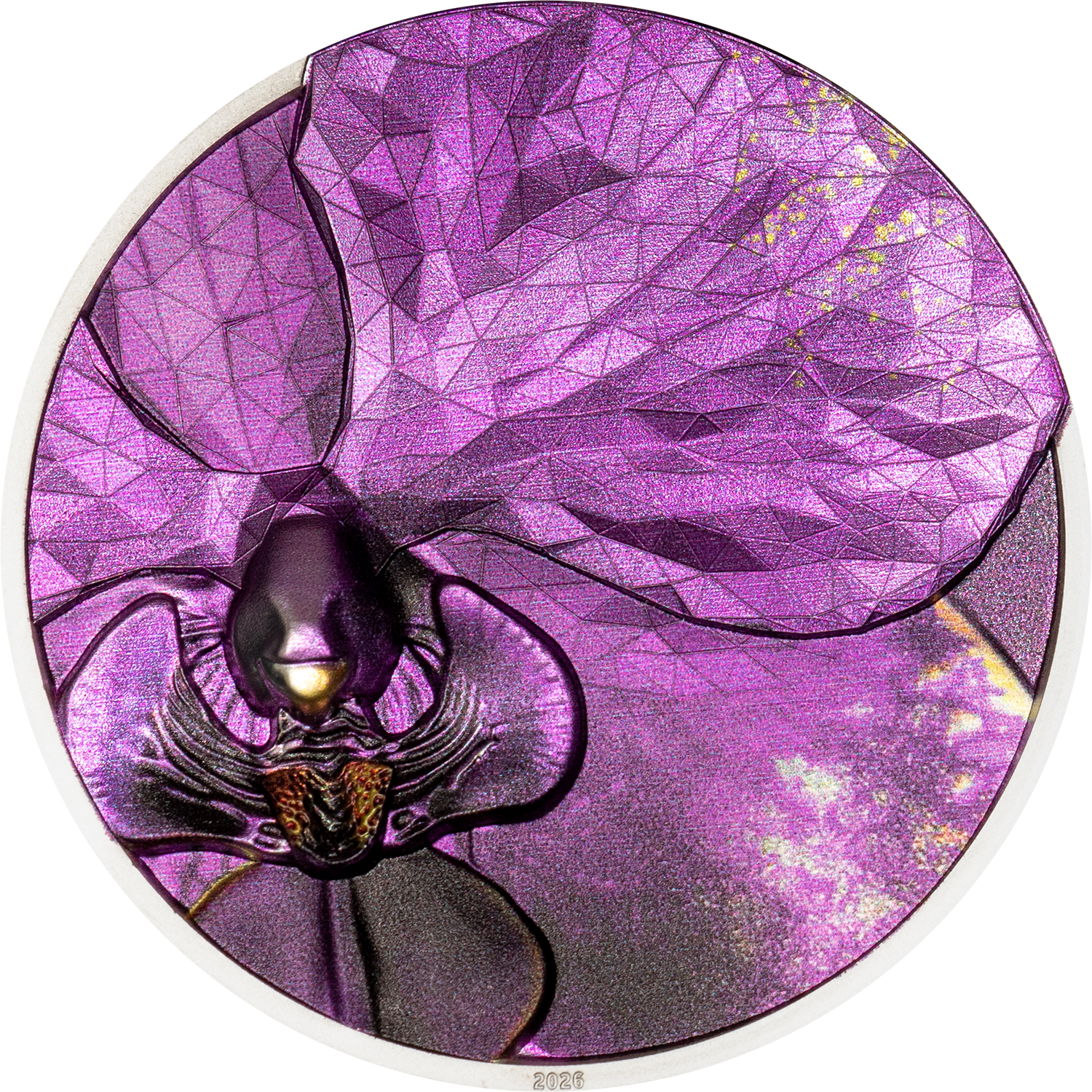 El elemento central del diseño es la artística coloración, que da vida a la flor en radiantes tonos metálicos de violeta y lila. Cada rayo de luz revela nuevas facetas, haciendo que la superficie parezca una obra de arte viva. Otro rasgo destacado es la estructura poligonal, que se extiende como una fina red geométrica sobre los pétalos. Estos elementos de baja poligonalidad confieren a la moneda una estética moderna y cristalina, creando un cautivador juego entre la forma natural y la geometría de precisión.