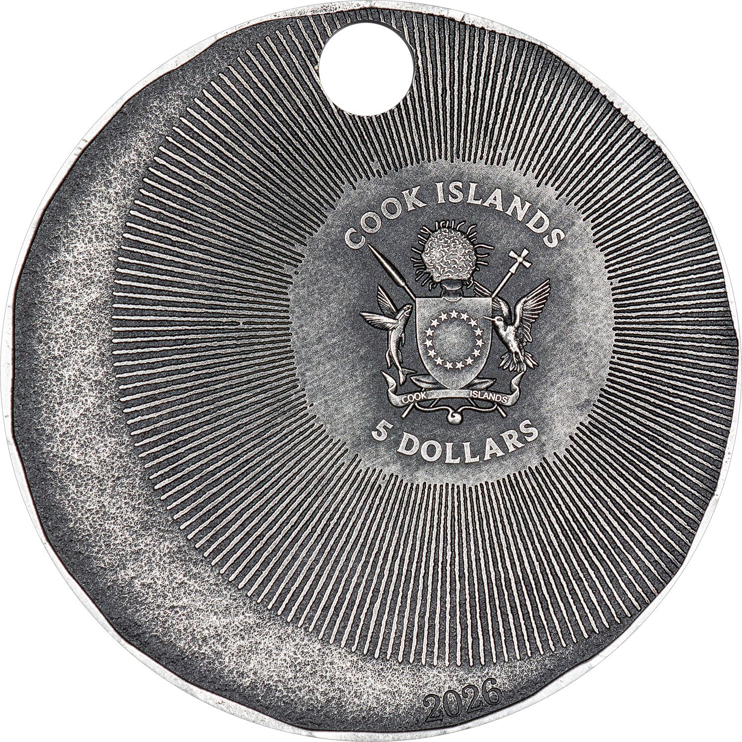 Plata 1 oz .9999 | Acabado Antiguo Oscuro | Portable (apertura en el canto) | 35 mm | Tirada: 1.500 | Islas Cook 2026 | Caja incluida