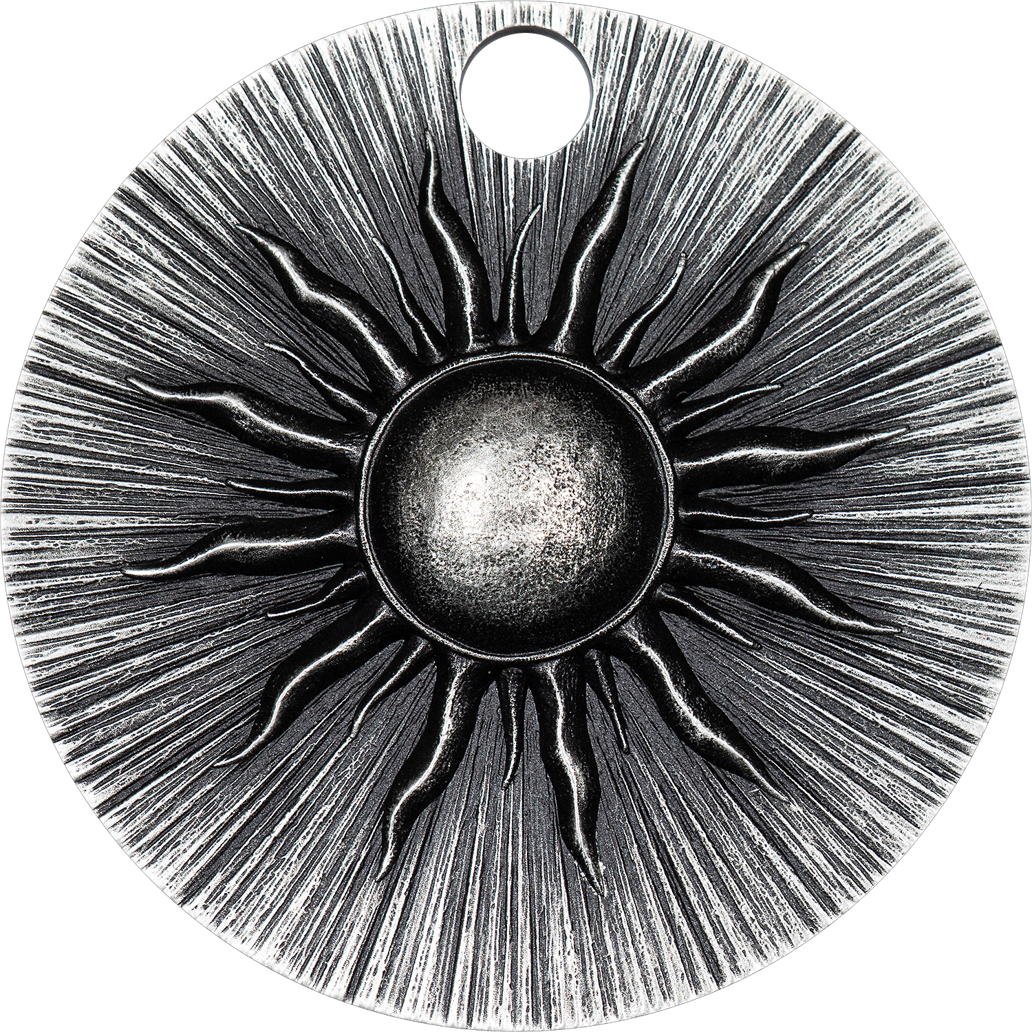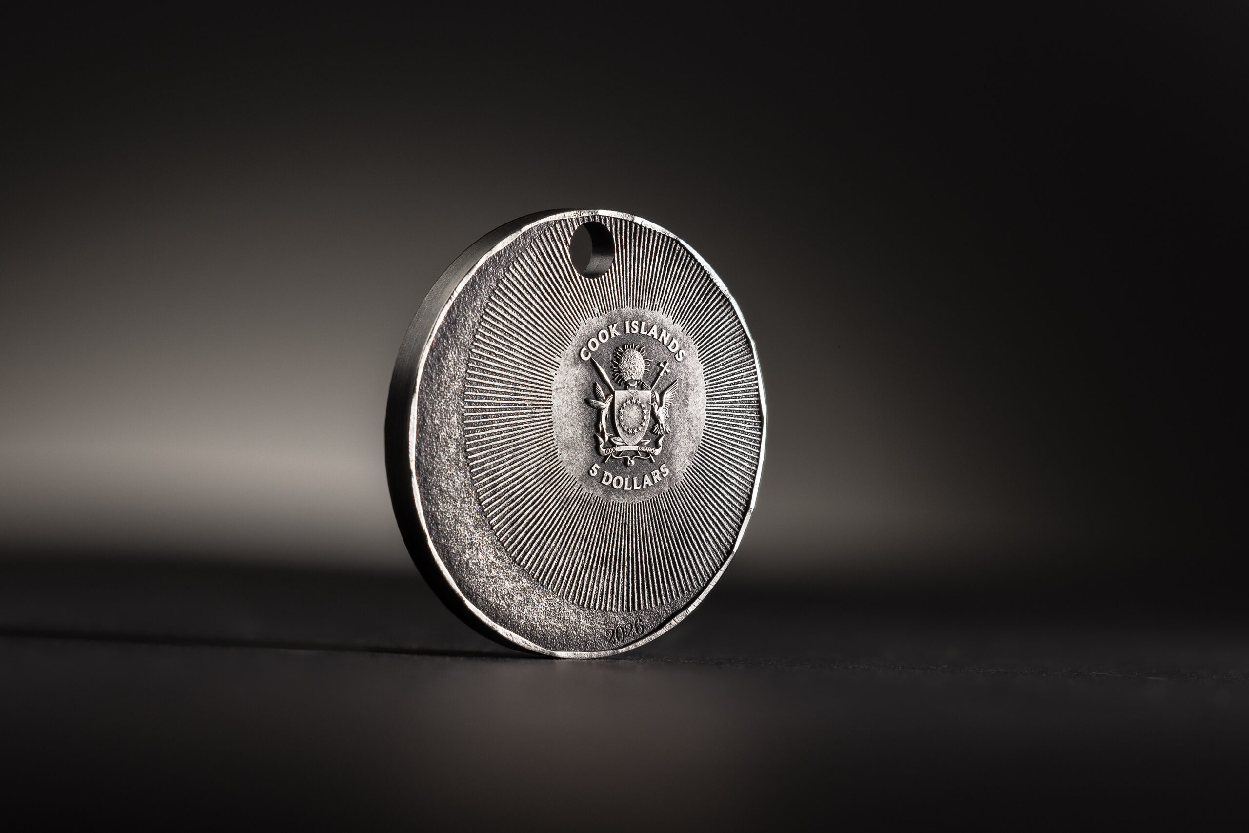 Más que una moneda: un talismán que se puede llevar puesto. Luminara presenta un radiante sol en el anverso y una luna creciente en el reverso, acuñados en 1 oz de plata con un nuevo acabado antiguo oscuro y la tecnología smartminting® de altorrelieve. Una apertura especial en el canto permite portarla en una cadena o cordón de cuero como amuleto personal, tan a gusto en una colección como alrededor del cuello. Limitada a 1.500 ejemplares. Collar no incluido.