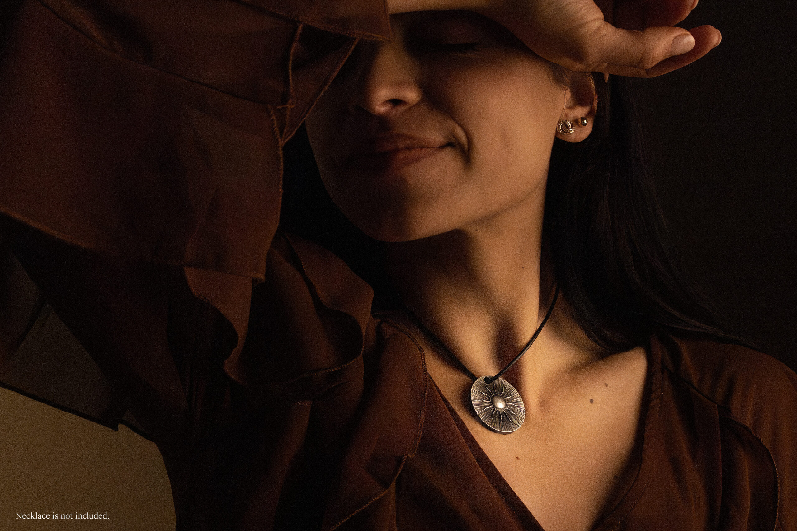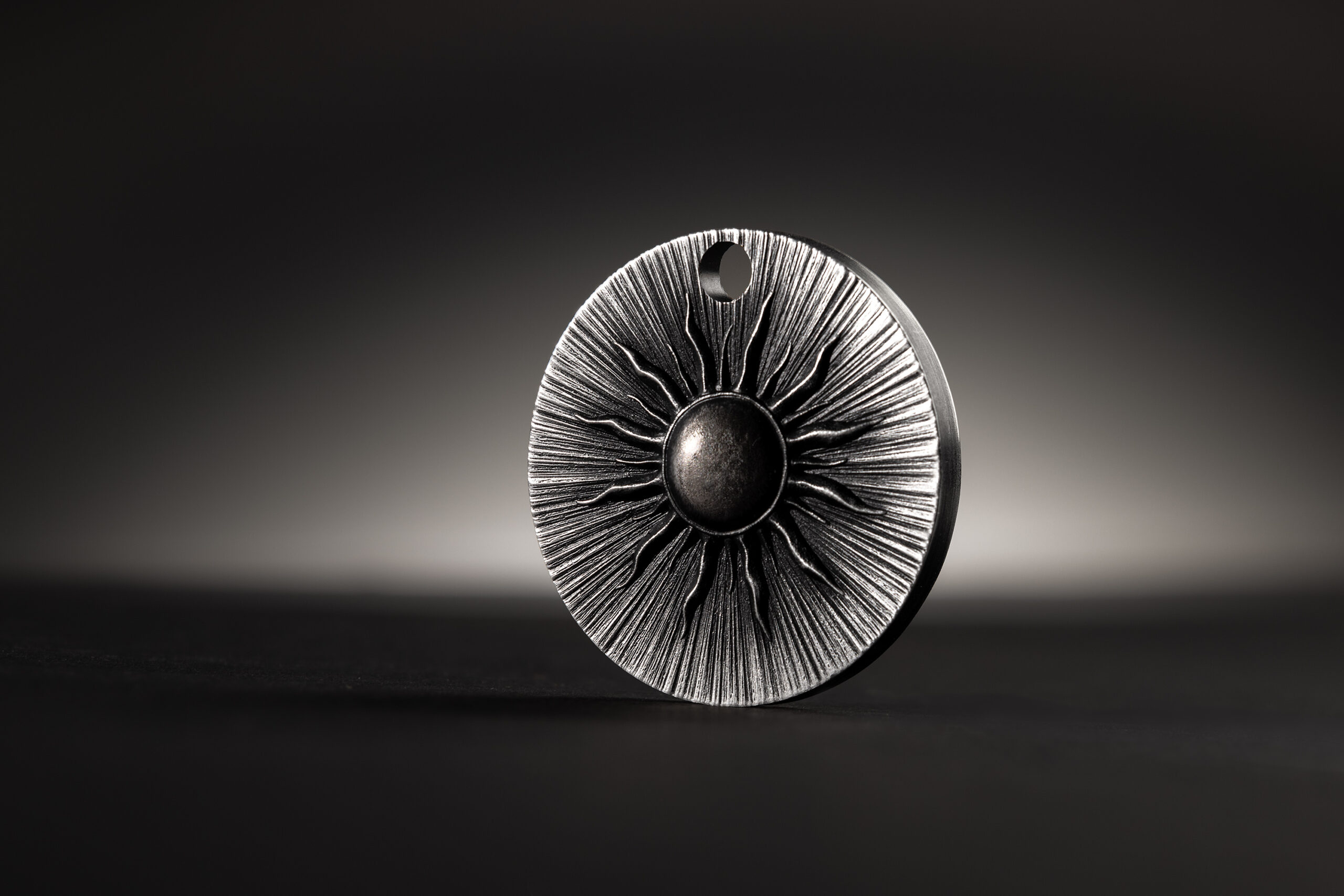 El anverso muestra un radiante sol con sus energéticos rayos irradiando con fuerza hacia el exterior. La fina textura del metal otorga a la luz un efecto casi pulsante, convirtiendo al amuleto en un símbolo tangible de esperanza y vitalidad. El reverso incorpora el motivo de la luz en un diseño deliberadamente minimalista: a la izquierda aparece una luna creciente curvada, símbolo del equilibrio entre la sombra y la luz, entre la calma y la energía.