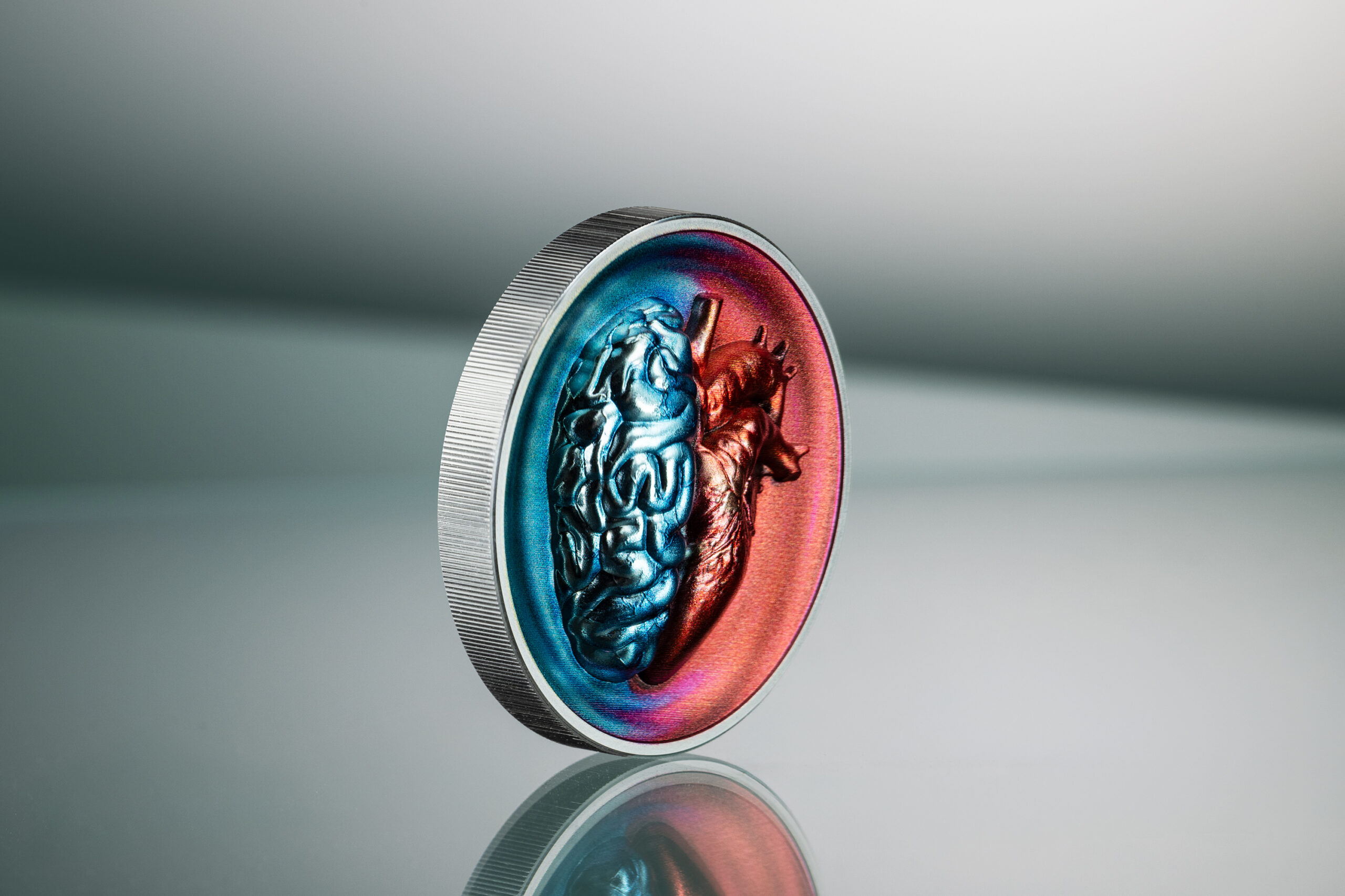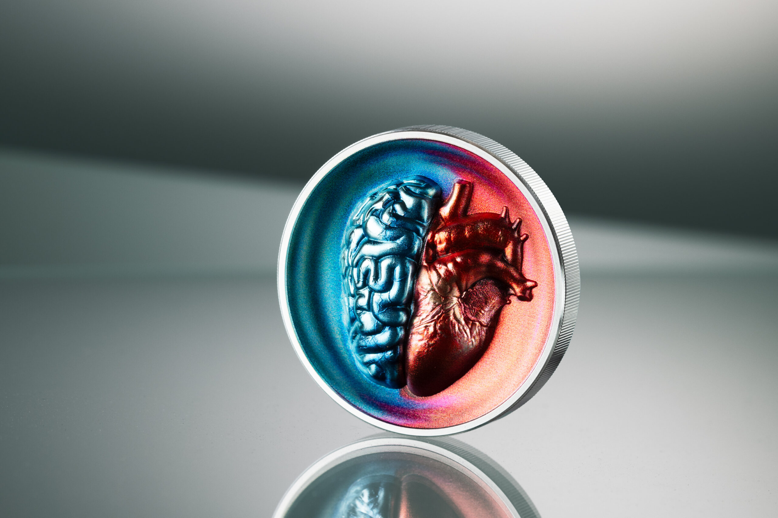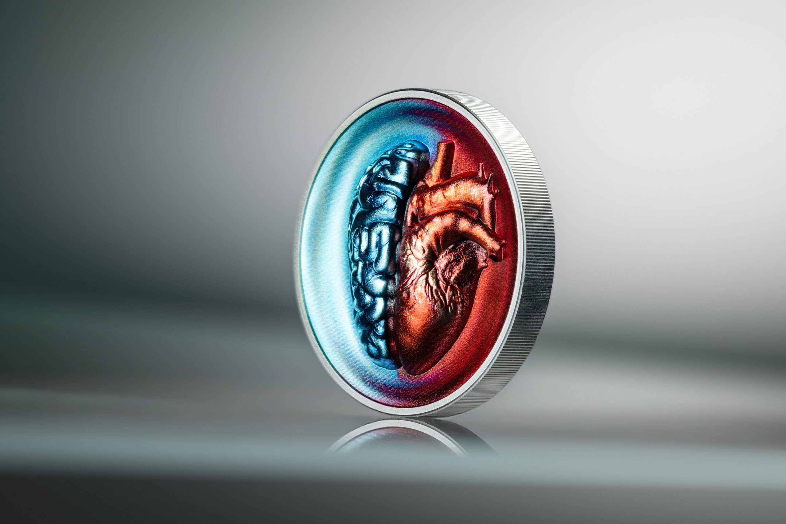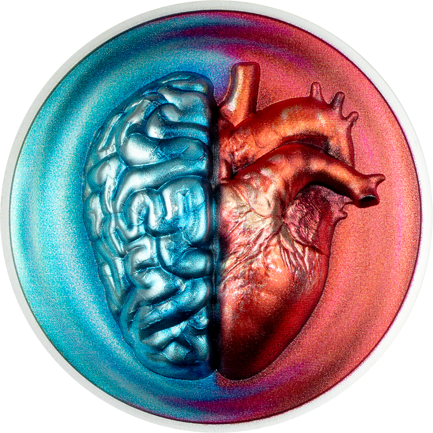 La razón frente a la emoción, inmortalizada en 2 oz de plata proof cóncava y coloreada. El cerebro aparece en fríos tonos azules que representan el intelecto y la razón; el corazón brilla en cálidos rojos que encarnan la pasión y la intuición. La forma cóncava profundiza el dramático contraste y sumerge al observador en este conflicto interior universal. Una experiencia numismática que invita a la reflexión, limitada a solo 500 ejemplares en el mundo.