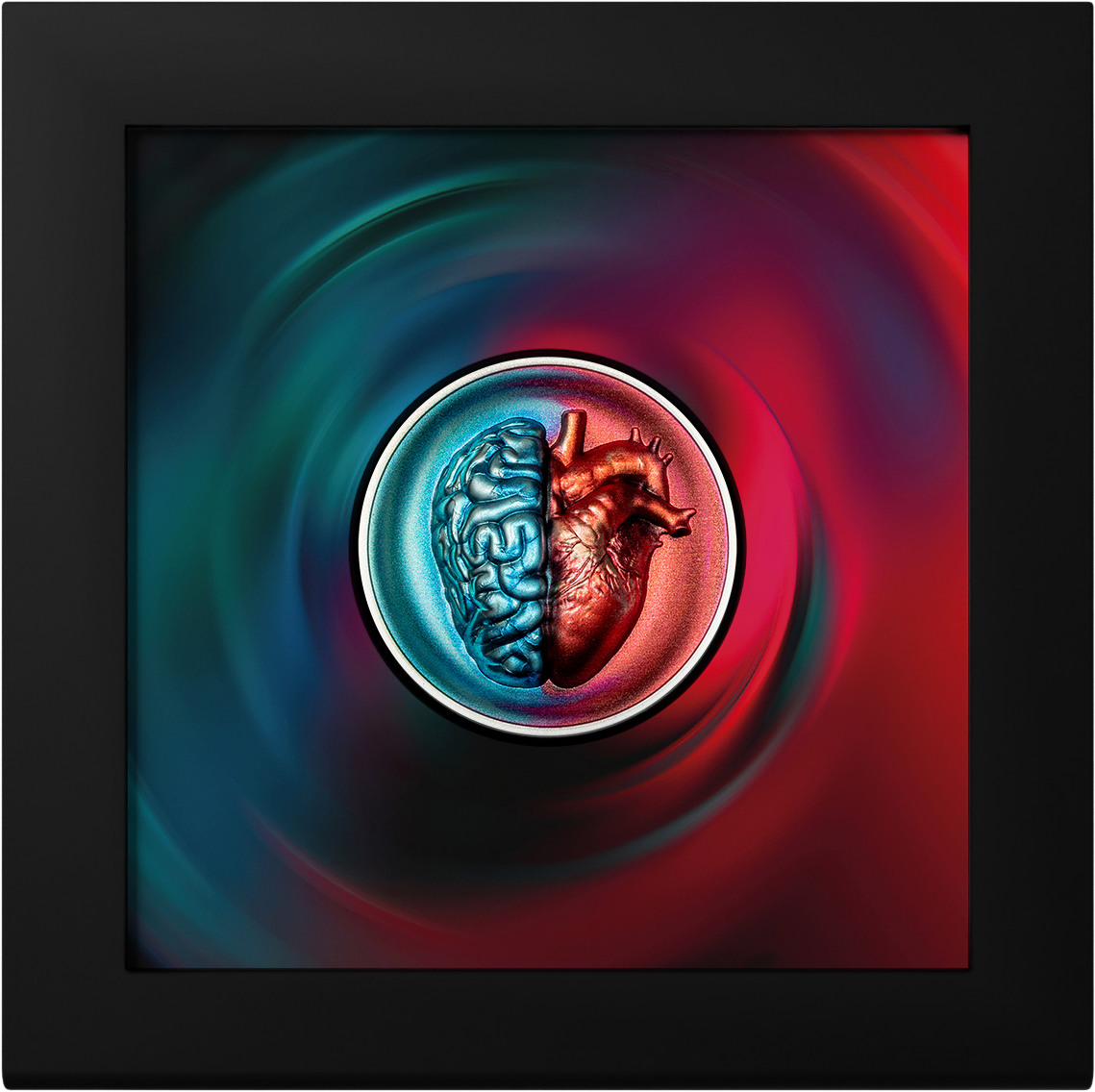 La forma cóncava realza la profundidad de la moneda, sumergiendo al observador en la tensión entre la razón y la emoción. La cabeza humana está representada en tonos fríos y racionales, simbolizando la lógica y el intelecto, mientras que el corazón resplandece en cálidos y ricos colores, representando la pasión y la intuición. El contraste deliberado en los colores intensifica el conflicto: frío contra cálido, mente contra alma, creando una pieza visualmente llamativa e intelectualmente provocadora.