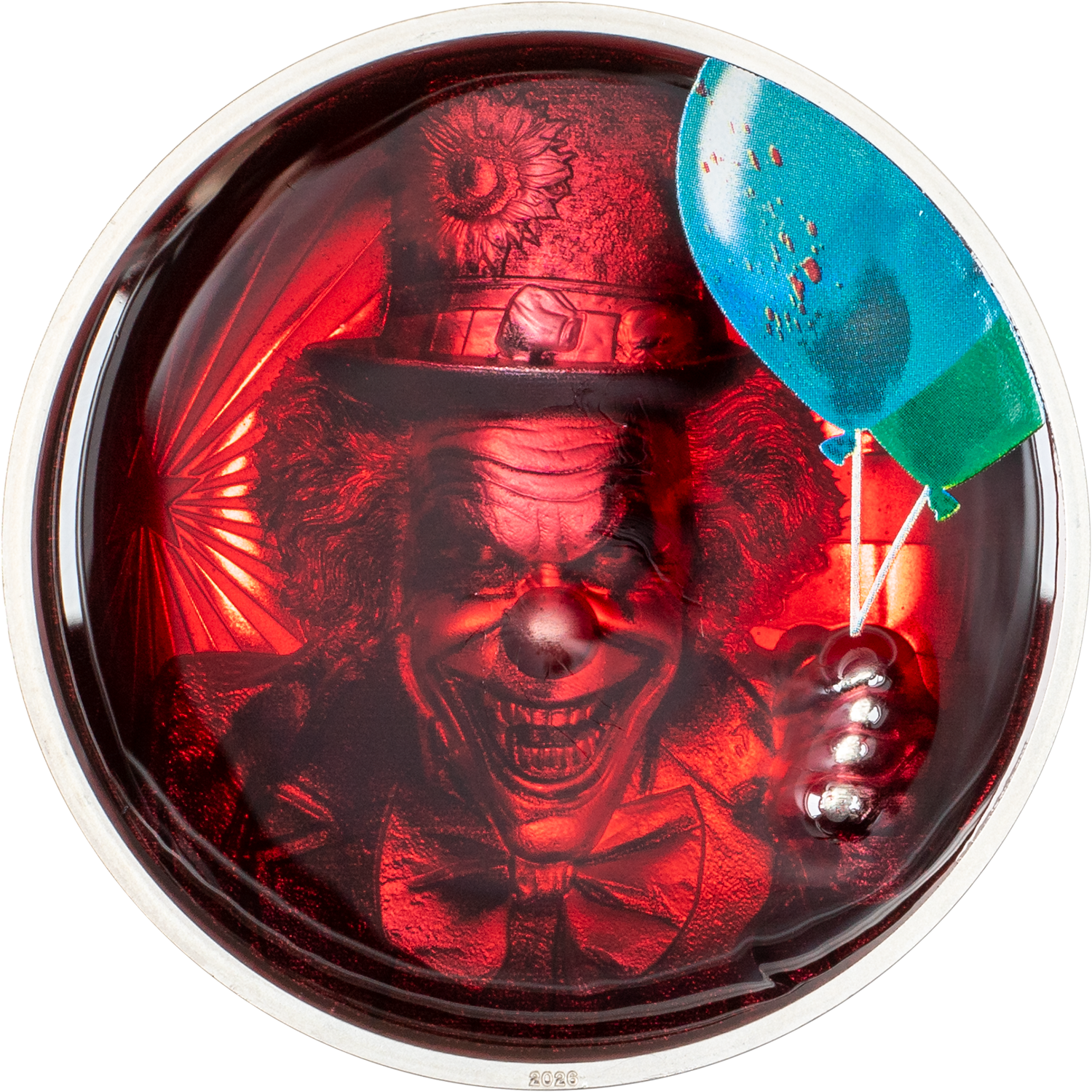 Todos estos aspectos quedan impresionantemente capturados en esta extraordinaria moneda de plata de 2 oz. El altorrelieve está recubierto de esmalte y realzado con una intensa coloración. El payaso parece estar esperando el momento de saltar de la moneda, limitada a solo 555 ejemplares en todo el mundo.