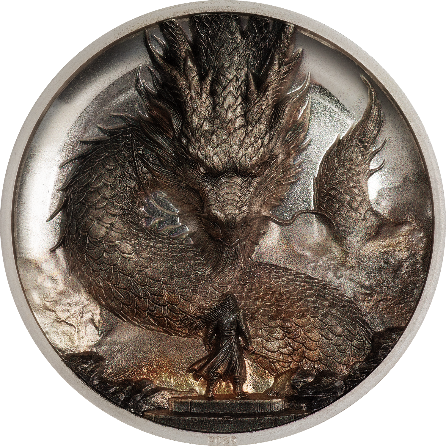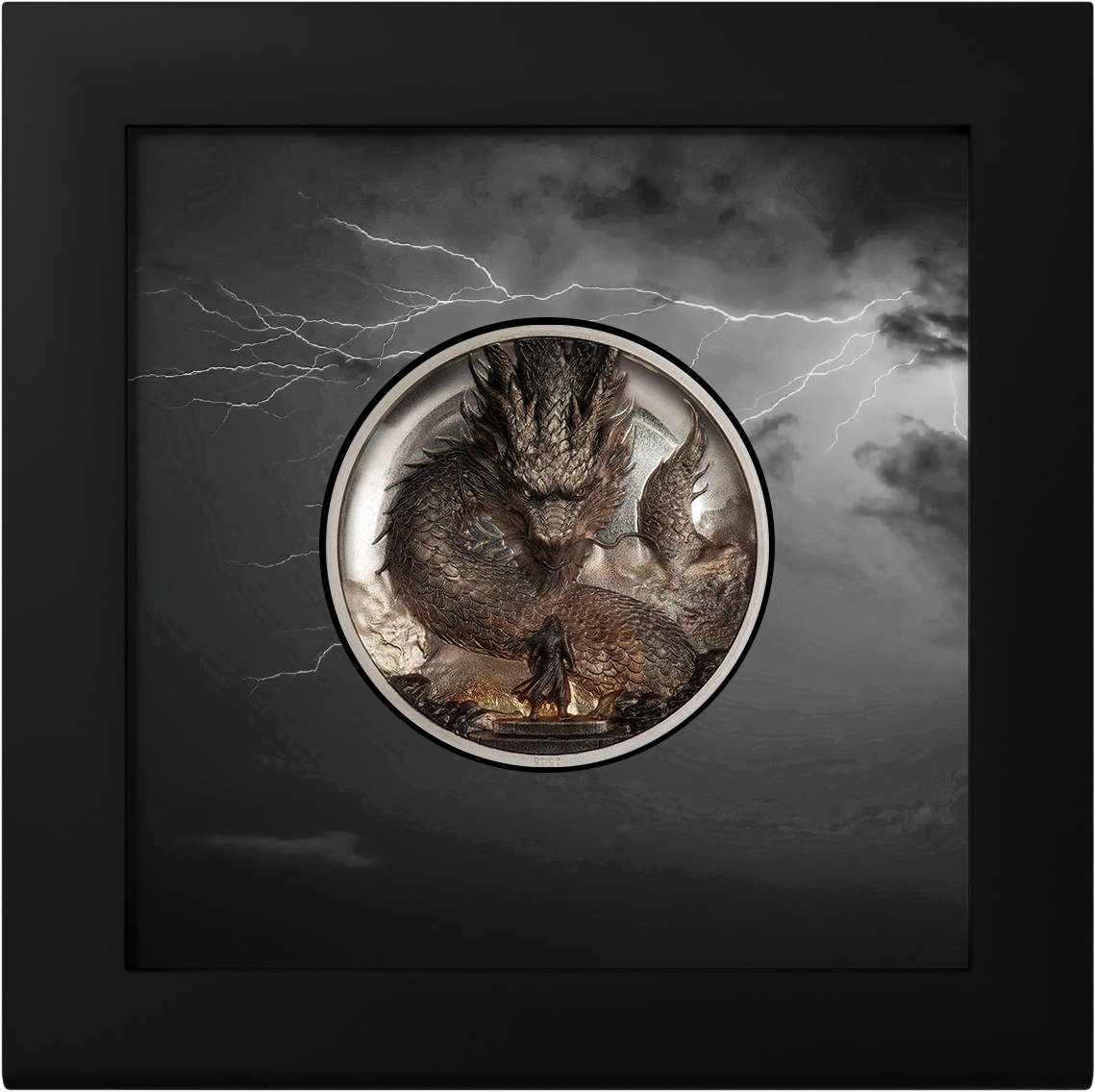 Ambos personajes están impresionantemente representados en la moneda de 3 oz con altorrelieve. La forma cóncava hace que el poderoso dragón parezca saltar desde la moneda. La sofisticada coloración sobre la superficie proof crea una atmósfera de fuego y trueno que juega con las fuerzas de la naturaleza.